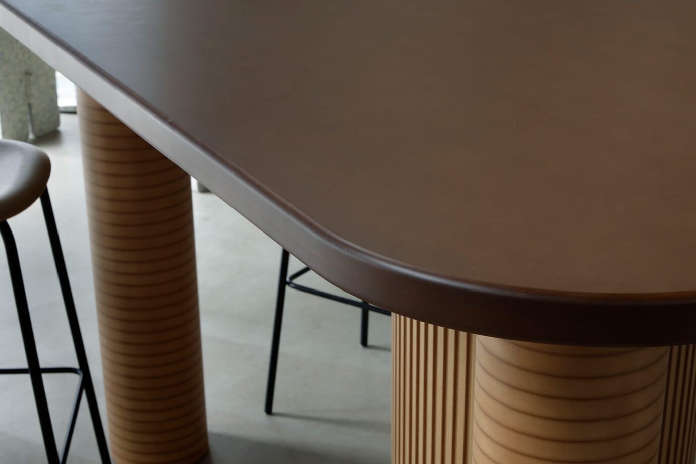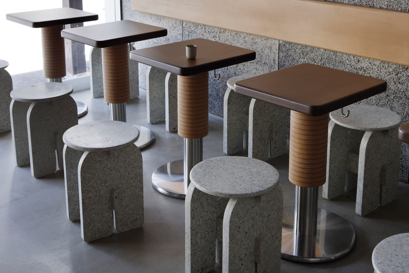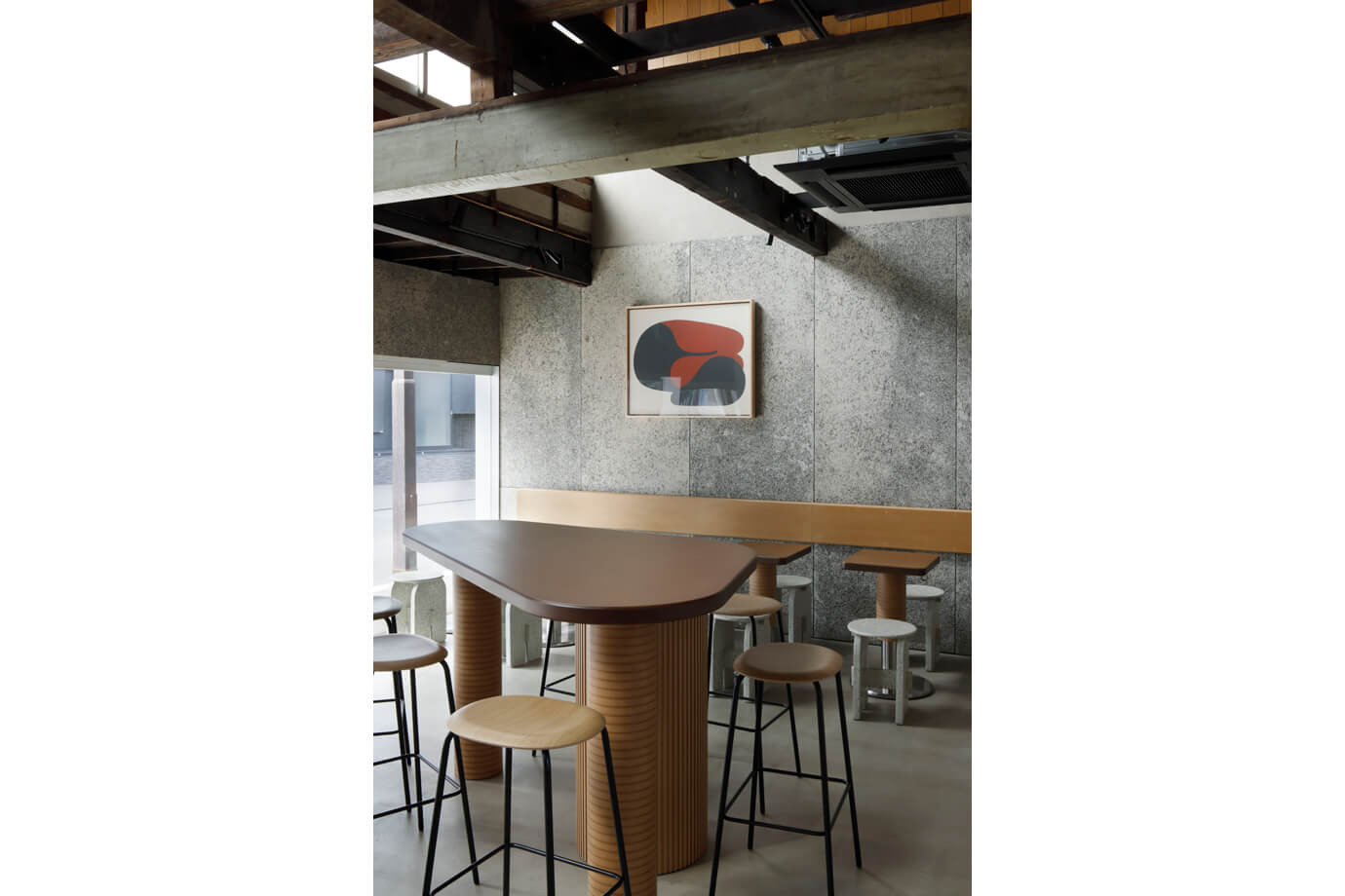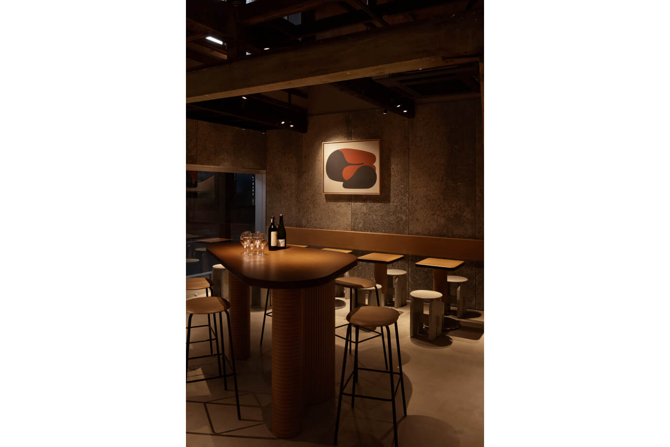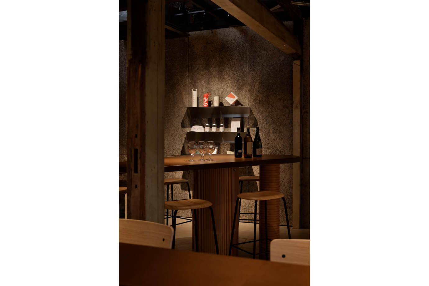 ゲストが最初に触れるエントランスのドアノブは、アキヒロジンさん(AKIHORO WOOD WORKS)にプロダクトデザインを依頼し、長年ウイスキーの熟成に使われてきた樽木をアップサイクルした。またテーブル什器全般は、静岡で70年の歴史を持つマルミヤ家具との共同で、MDFを用いたオリジナルファニチャーを制作。メインカウンターは、色味やテクスチャーを調整できる左官材を用いることで、空間に個性を添えつつ全体を調和させる重要な存在となっている。