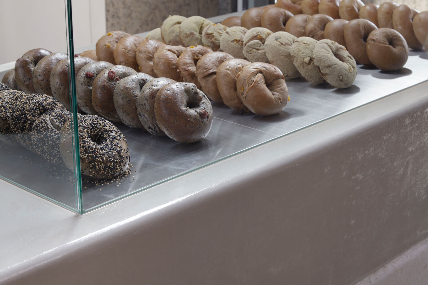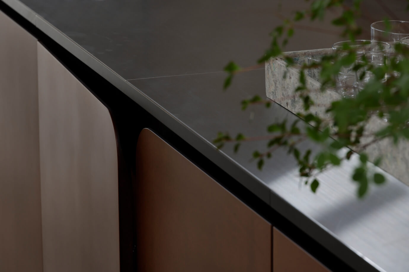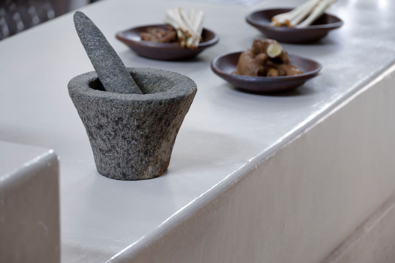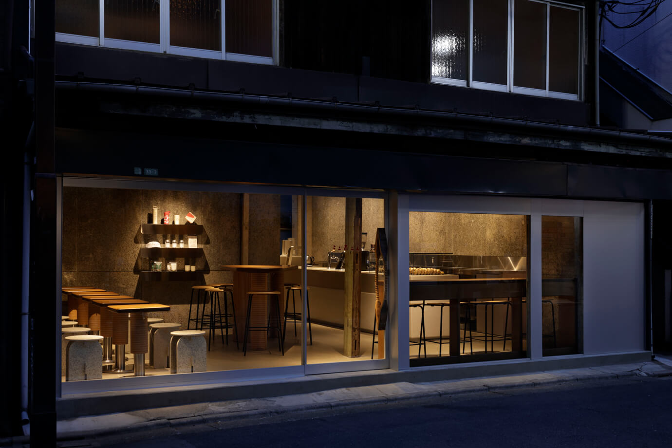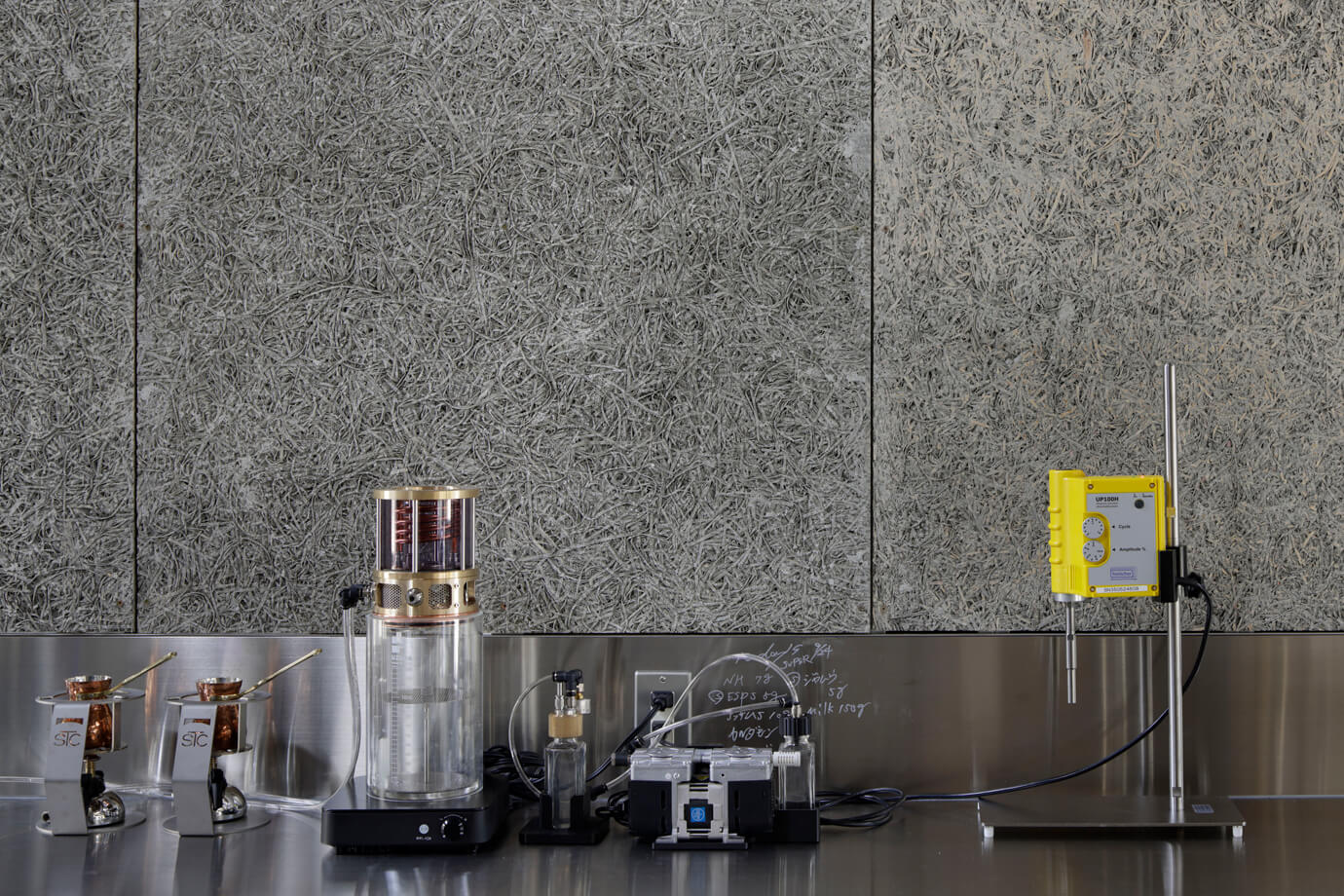 ゲストが最初に触れるエントランスのドアノブは、アキヒロジンさん(AKIHORO WOOD WORKS)にプロダクトデザインを依頼し、長年ウイスキーの熟成に使われてきた樽木をアップサイクルした。またテーブル什器全般は、静岡で70年の歴史を持つマルミヤ家具との共同で、MDFを用いたオリジナルファニチャーを制作。メインカウンターは、色味やテクスチャーを調整できる左官材を用いることで、空間に個性を添えつつ全体を調和させる重要な存在となっている。